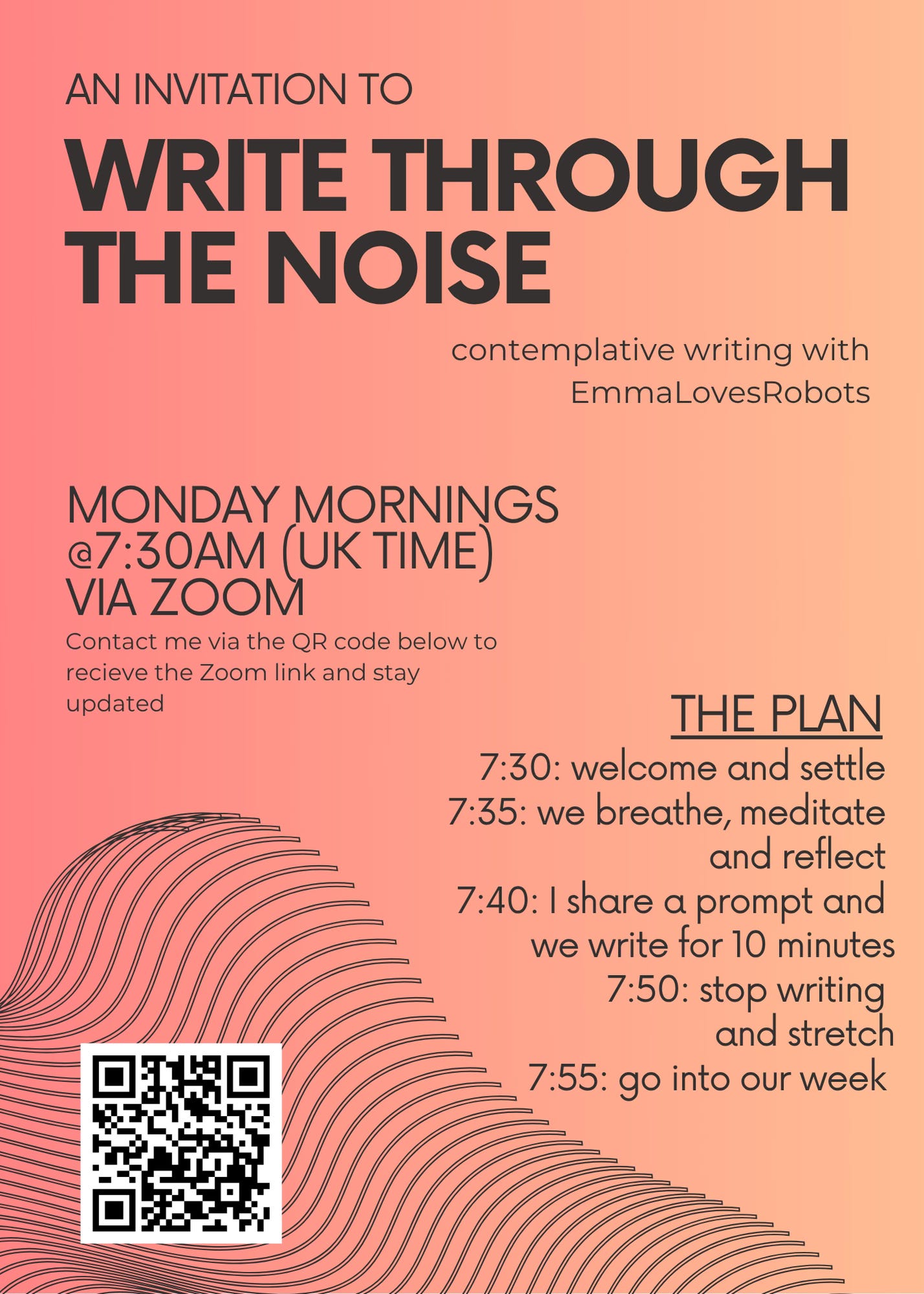 This year, you have been learning how to facilitate writing sessions inspired by Miriam’s contemplative writing. You’re ready to offer them into the world firstly though Monday Morning short writing sessions. For more about contemplative writing and these sessions – see write through the noise.